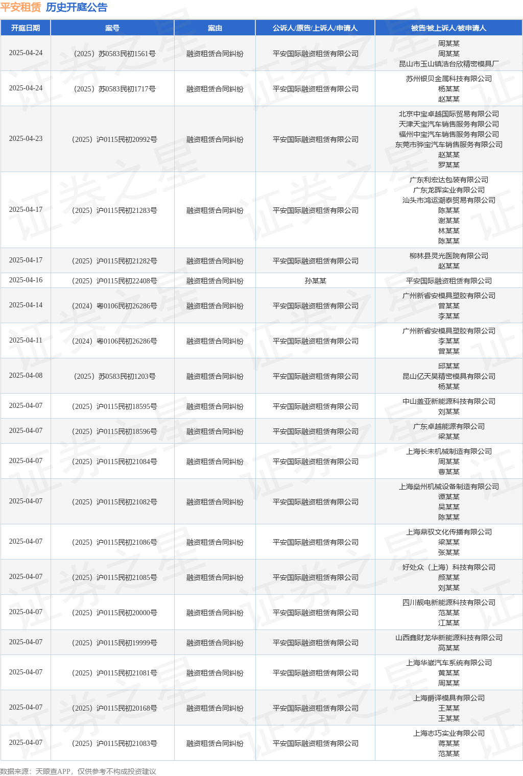 案号:(2025)沪0115民初7013号审理法院:上海市浦东新区人民法院案由:融资租赁合同纠纷当事人信息: 原告/上诉人:刘某某 被告/被上诉人:平安国际融资租赁有限公司开庭日期:2025年2月19日根据统计,近一年内以平安国际融资租赁有限公司为当事人的历史开庭公告有1772则,其中案由为“融资租赁合同纠纷”的公告以1669则居首,其次为“申请实现担保物权”有42则,“买卖合同纠纷”有13则。历史开庭公告(前20条)如下: